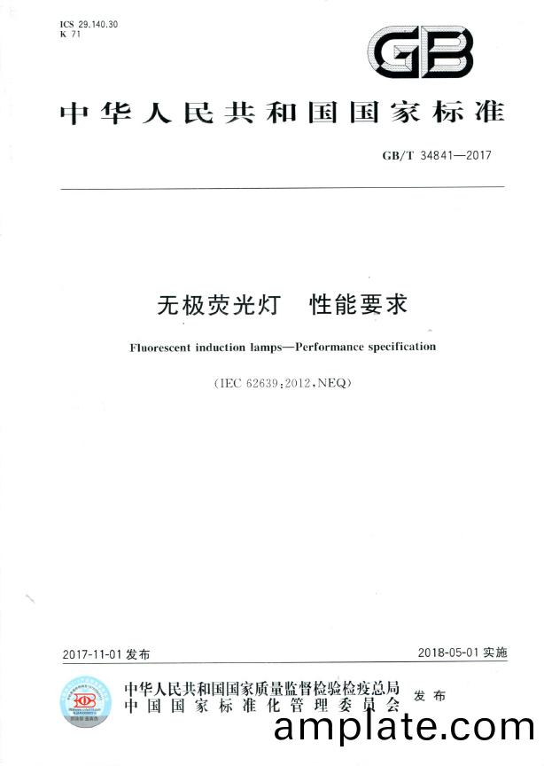 《無(wu)極熒(ying)光(guang)燈 性能要(yao)求(qiu)》標準(zhun)號GB/T 34841-2017: