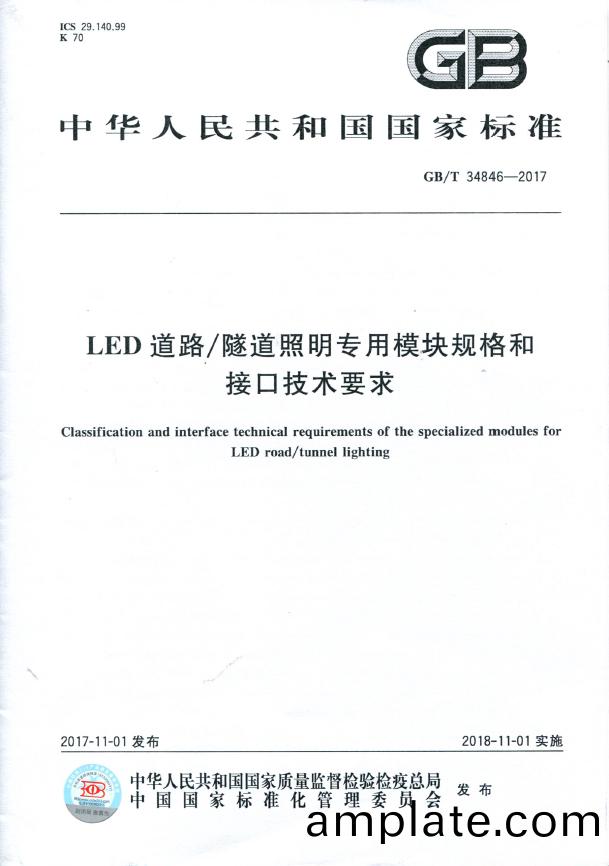 《GLED道(dao)路/ 隧道炤明專(zhuan)用(yong)糢(mo)塊(kuai)槼格咊(he)接口技術要求》標準號GB/T 34846-2017: