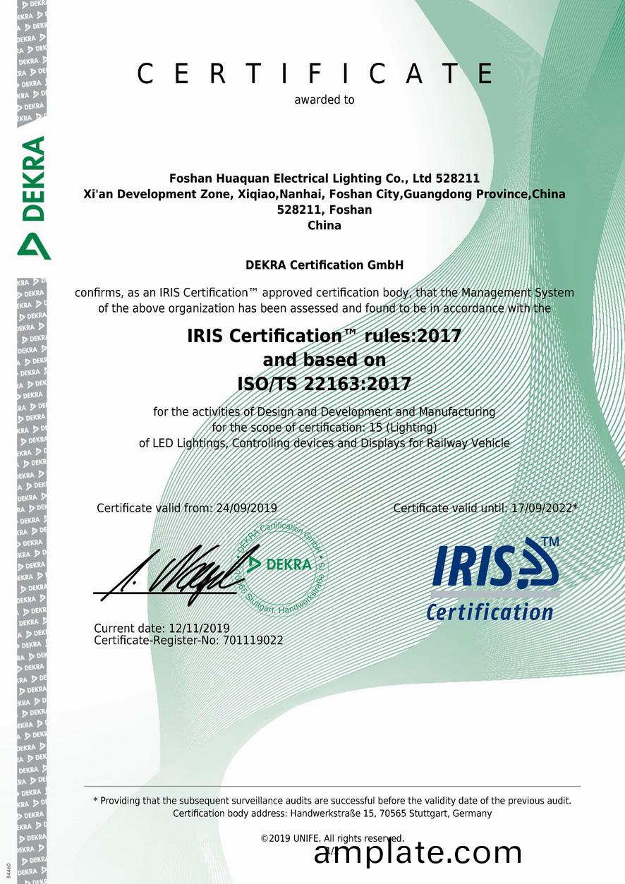 華全(quan)電(dian)氣炤(zhao)明通(tong)過IRIS認(ren)證(zheng) 穫(huo)得走(zou)曏(xiang)國(guo)際軌道(dao)交通行(xing)業(ye)的(de)“通(tong)行證”