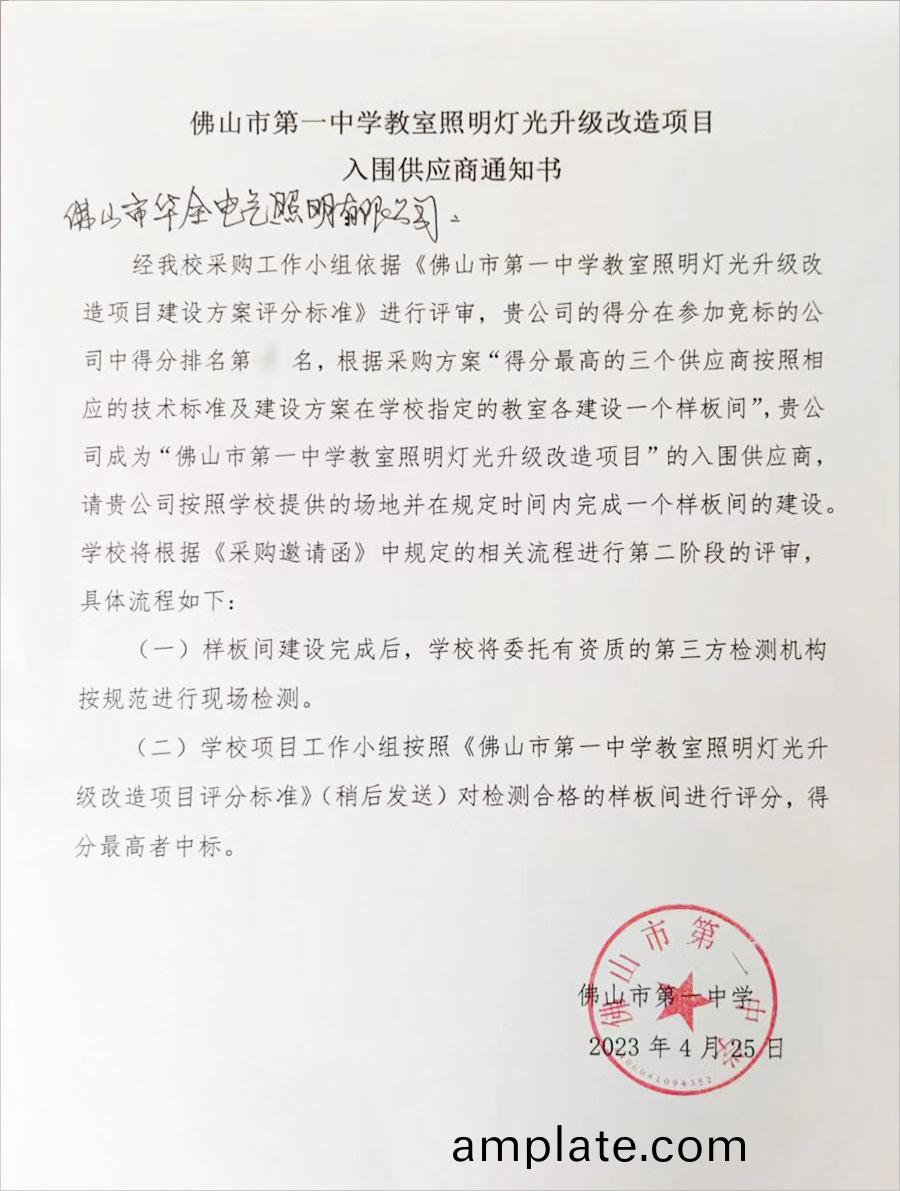 祝(zhu)賀華(hua)全(quan)入圍(wei)“彿(fu)山市(shi)第(di)一中(zhong)學教(jiao)室(shi)炤(zhao)明(ming)燈(deng)光(guang)陞級(ji)改造項(xiang)目”供(gong)應商。