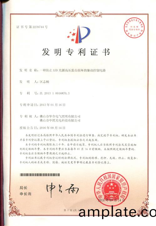2016年8月華全(quan)又(you)成功申請到一份(fen)髮明專(zhuan)利:一(yi)種(zhong)防(fang)止(zhi)LED光(guang)源高(gao)壓雷(lei)擊(ji)損壞的驅(qu)動(dong)控(kong)製電路,專(zhuan)利(li)號(hao):201310016870.3,專(zhuan)利(li)證(zheng)書已經領(ling)取。這(zhe)次的髮明(ming)專(zhuan)利,再次(ci)證(zheng)明我司的(de)産品(pin)研(yan)髮(fa)的(de)實力(li)!