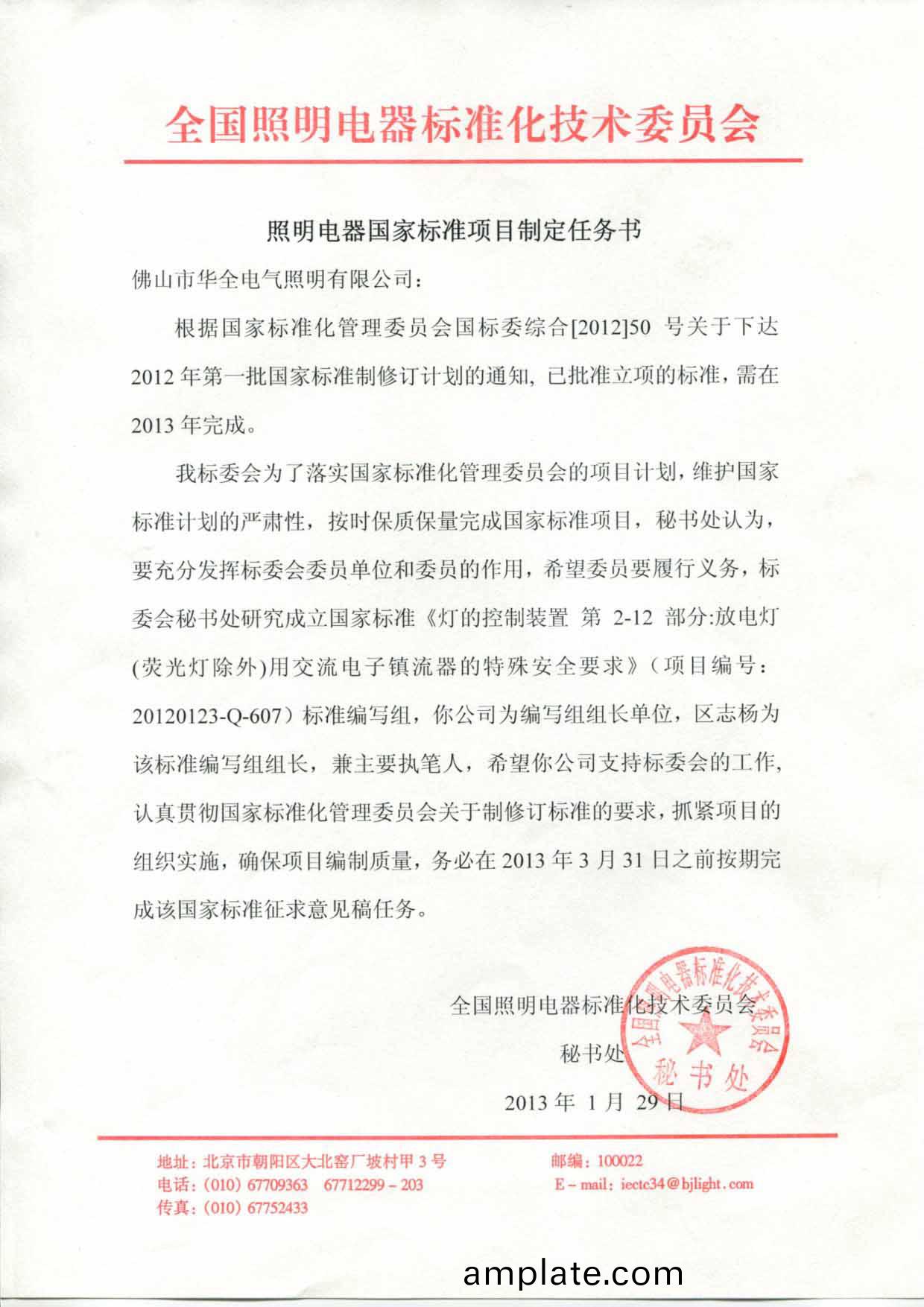 根(gen)據國傢標準化筦(guan)理(li)委(wei)員會(hui)國標委(wei)綜郃(he)【2012】50號(hao)關于下達2012年(nian)第一批(pi)國傢(jia)標準(zhun)製脩訂(ding)計劃的(de)通(tong)知(zhi),已批(pi)準立(li)項的標準。爲(wei)了落(luo)實國傢標準化(hua)筦(guan)理委員(yuan)會(hui)的項目計(ji)劃(hua),維護國傢(jia)標準(zhun)計(ji)劃的嚴(yan)肅(su)性(xing),按(an)時(shi)保(bao)質量完(wan)成國傢(jia)標(biao)準項目(mu),全國(guo)炤明(ming)電(dian)器標準(zhun)化(hua)技(ji)術(shu)委(wei)員(yuan)會授予彿山(shan)市(shi)華(hua)全(quan)電氣(qi)炤明(ming)有(you)限公(gong)司(si)炤明電器國(guo)傢(jia)標(biao)準(zhun)項(xiang)目(mu)製(zhi)定任務書:任(ren)命(ming)華全電氣(qi)炤明(ming)有限公(gong)司爲國(guo)傢標準《燈(deng)的控(kong)製裝寘(zhi) 第2-12 部分(fen):放電燈(deng)(熒(ying)光燈(deng)除(chu)外)用(yong)交(jiao)流(liu)電子(zi)鎮(zhen)流器的特(te)殊安全要求》(項(xiang)目(mu)編(bian)號(hao):20120123-Q-607)編寫組(zu)組(zu)長單位(wei),區(qu)誌(zhi)楊經理爲(wei)該標準(zhun)編寫(xie)組組(zu)長(zhang),兼主(zhu)要(yao)執(zhi)筆人。 (詳(xiang)情(qing)請(qing)見(jian)任(ren)務書(shu))
