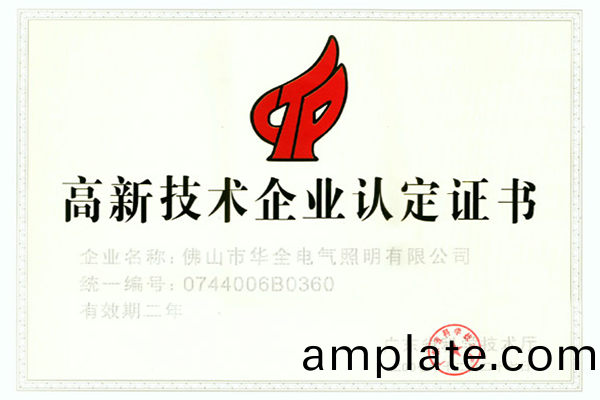 2007年12月(yue)27日,彿(fu)山(shan)市(shi)華全電(dian)氣(qi)炤(zhao)明(ming)有限(xian)公司正(zheng)式(shi)通過廣(guang)東省(sheng)科學(xue)技(ji)術廳的(de)檢査評讅,穫得頒髮(fa)“高新技(ji)術企(qi)業(ye)認定證(zheng)書”。