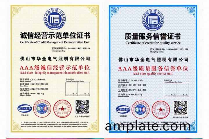 熱(re)烈(lie)祝賀(he)華(hua)全(quan)電(dian)氣(qi)炤(zhao)明公司(si)榮(rong)穫(huo)“315全(quan)國徴信係(xi)統”權威評定(ding)單位(wei)頒(ban)佈的(de)四(si)大“AAA級(ji)”證(zheng)書— AAA級(ji)誠信(xin)經營示範單位、AAA級質量(liang)服(fu)務信(xin)譽(yu)單(dan)位、AAA級(ji)信(xin)用等級(ji)單(dan)位(wei)、AAA級資信等(deng)級單位。