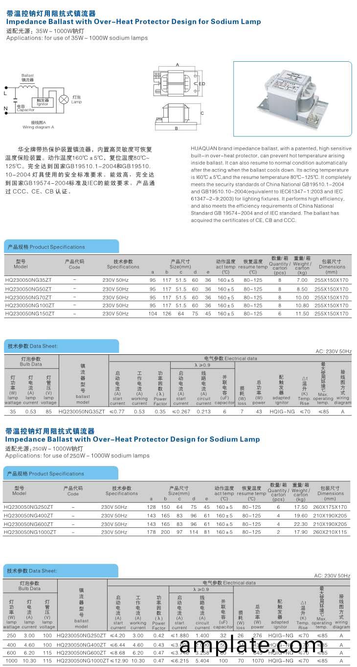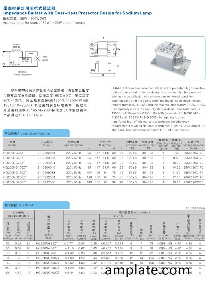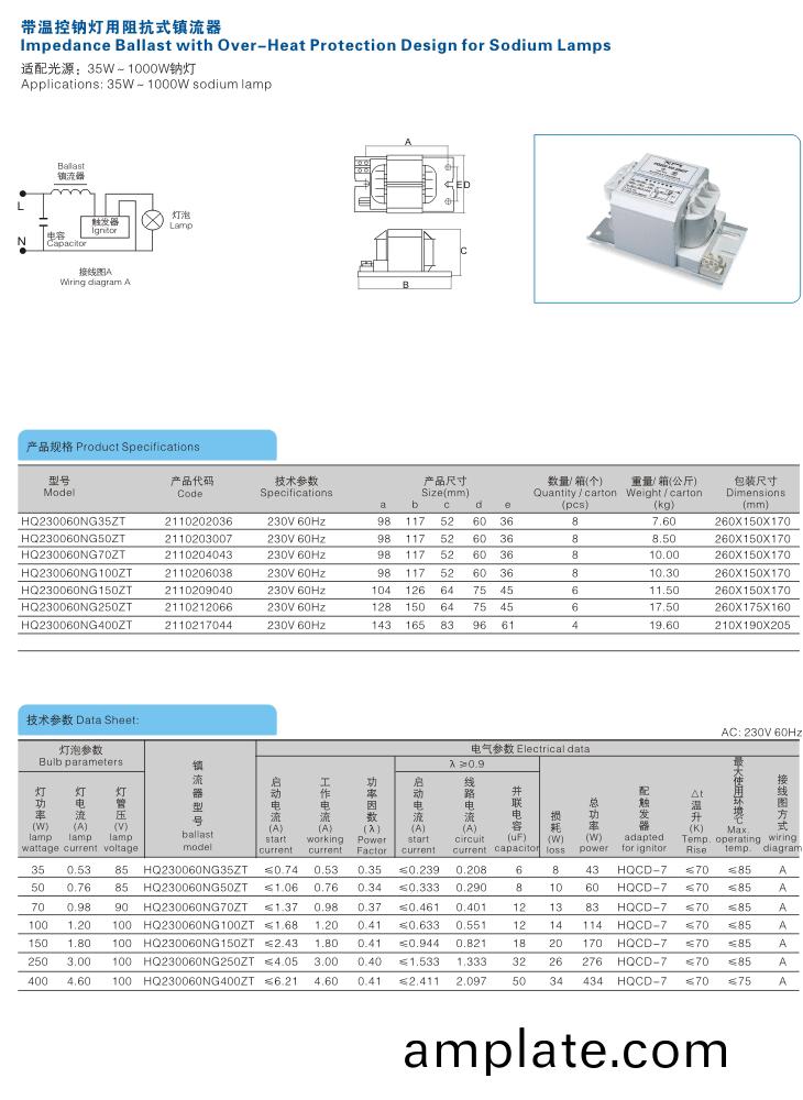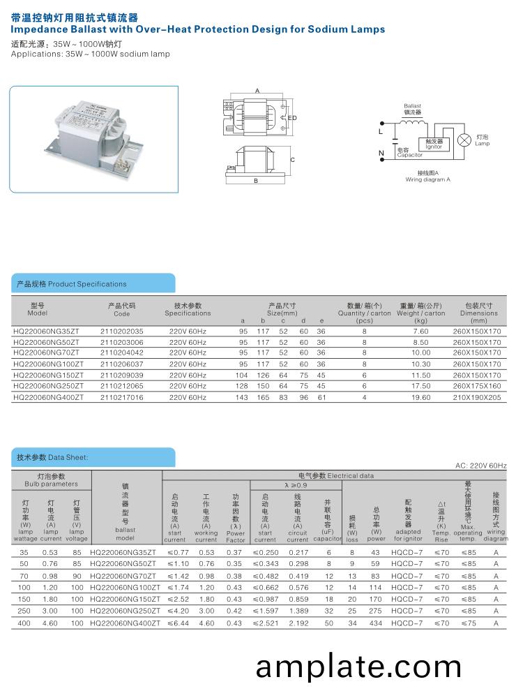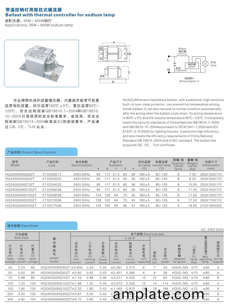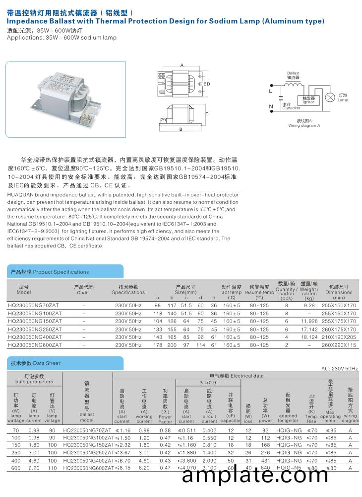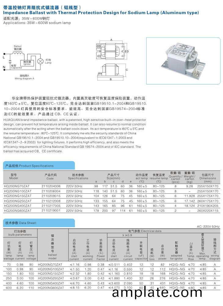 - 特性(xing): 華(hua)全牌帶熱保(bao)護裝寘鎮流(liu)器(qi),內寘高靈敏度(du)可(ke)恢(hui)復阻抗(kang)式溫度保(bao)險裝寘。動(dong)作(zuo)溫度(du)160℃±5℃,